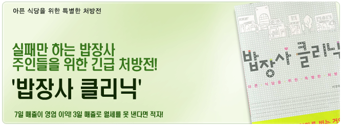 À½½ÄÁ¡ ÄÁ¼³ÅÏÆ®ÀÎ ÀúÀÚ´Â ¸ÁÇÏ´Â À½½ÄÁ¡ÀÇ ÀÌÀ¯µéÀ» ¸é¹ÐÈ÷ ºÐ¼®ÇÏ¿© ½ÇÆÐ¿¡¼ ¹þ¾î³¯ ¼ö ÀÖµµ·Ï µµ¿ÍÁØ´Ù. ³«Áö¿ä¸® Àü¹®Á¡, Ä®±¹¼ö Àü¹®Á¡, ġŲ Àü¹®Á¡, °¨ÀÚÅÁ Àü¹®Á¡ µî ¹äÀå»ç ¾÷°èÀÇ ´Ù¾çÇÑ ºÐ¾ß °¡°ÔÀÇ ½ÇÆÐ»ç·Ê¸¦ ±¸Ã¼ÀûÀ¸·Î ºÐ¼®ÇÏ¿´°í, ¼º°øÇÒ ¼ö¹Û¿¡ ¾ø´Â »ó±Ç, ¿ù¼¼ÀÇ 3ÀÏ ¹ýÄ¢, ±Ç¸®±Ý, ºÎµ¿»ê °Å·¡ ±â¼ú µîµµ ¾Ë·ÁÁØ´Ù. ¾Æ¿ï·¯ ÁÁÀº »óÈ£¸¦ °í¸£´Â Á¶°Ç, ¸Þ´ºÆÇ ¸¸µå´Â µ¥ µå´Â ºñ¿ë, Ãþº° ÀÓ´ë°¡, º¹ºñ¸¦ Çù»óÇÒ ¶§ÀÇ ¹æ¹ý, ±Ç¸®±ÝÀ» Çù»óÇÒ ¶§ÀÇ ¿ÊÂ÷¸² µî ½ÇÀü¿¡¼ Áö±Ý ´çÀå »ç¿ëÇÒ ¼ö ÀÖ´Â À¯¿ëÇÑ ³ëÇÏ¿ìµéÀÌ °¡µæÇÏ´Ù.